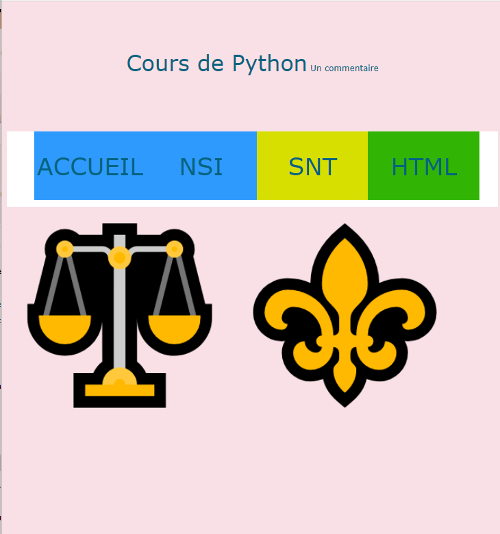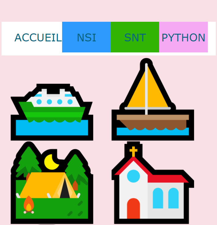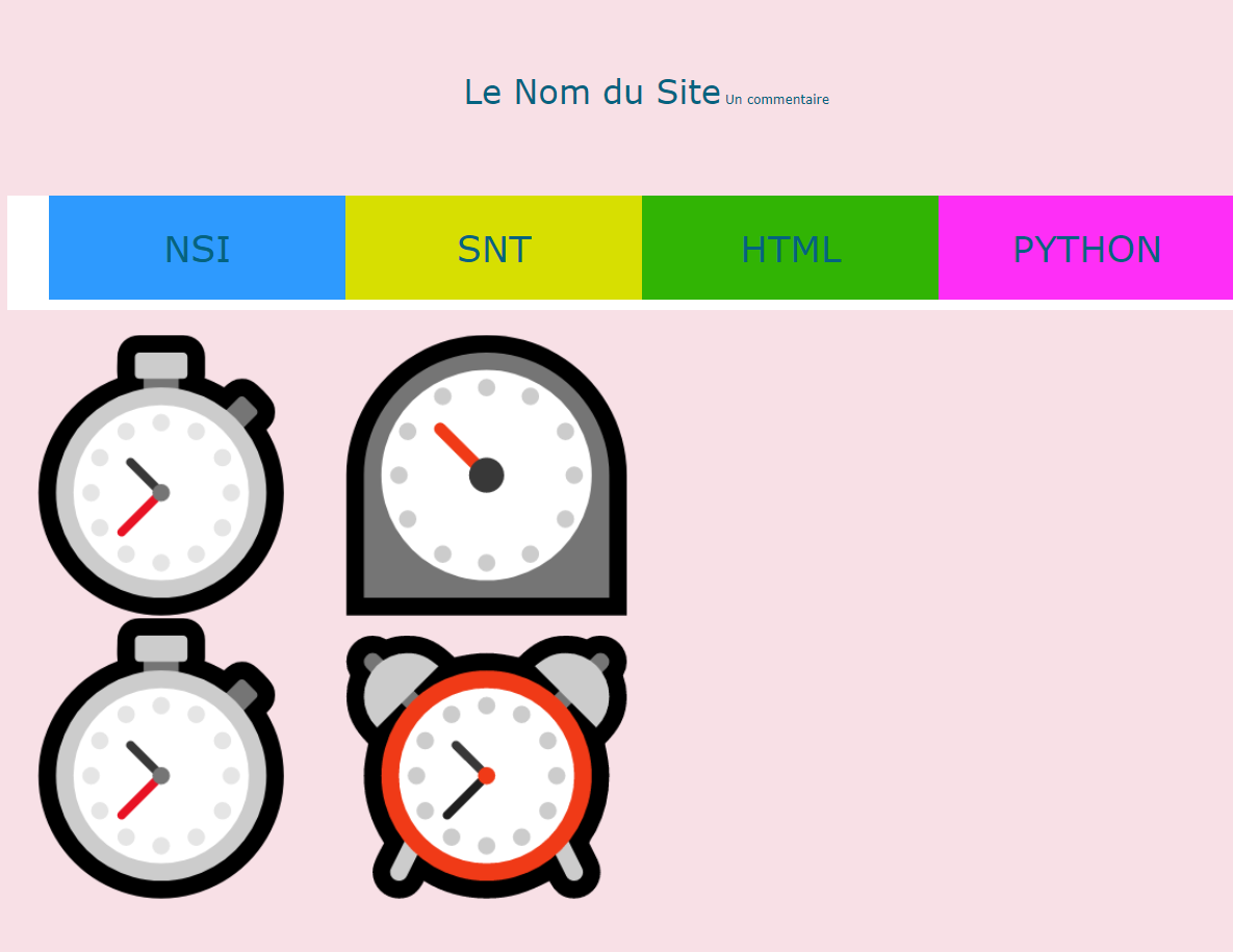 Il y a 5 fichiers html: index.html, qui donne accès aux 4 fichiers : nsi.html; html.html; python.html; snt.html Le fichier CSS : style.css, détermine la forme du site |