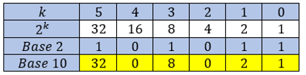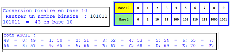 En base 2 le nombre 101011 est égal en base 10 à : \(32 + 8 + 2 + 1 = 43\)